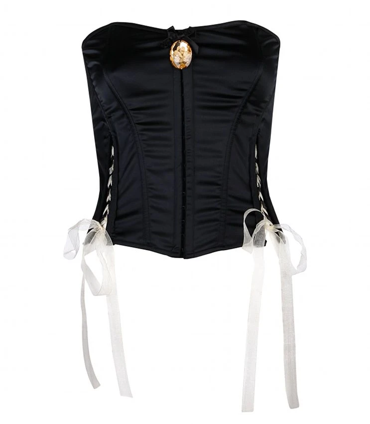 Diese Corsage besteht aus schwarzem Stretch-Satin. Sie hat vorne auf beiden Seiten seitlich und auf der Rückseite Schnürungen aus zartem, puder-farbenem Taft-Band. Die Corsage wird auf der Vorderseite mit einem Häkchenverschluss geschlossen. Das Decolleté ziert ein Satin-Schleifchen und großer, bernsteinfarbener Medaillon-Kristall.