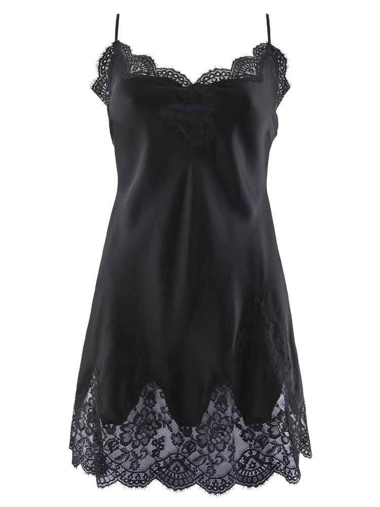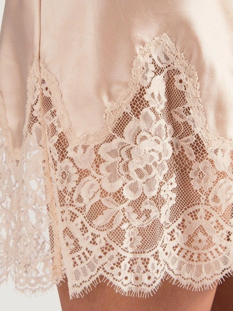 Das Negligé ist am Decolleté und zusätzlich am Saum umlaufend mit der weichen Spitze benäht. Durch die feine Verarbeitung und den körpernahen Schnitt ist dieses Modell auch als Unterkleid tragbar. Im Rücken hat dieses kurze Seidennegligé einen Schnüreinsatz und ist daher etwas in der Weite anpassbar.