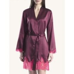 Der Kimono ist an den Ärmelenden und am unteren Saum mit Spitze besetzt. Er wird gewickelt getragen und hat einen Bindegürtel aus Seide. Der Seiden-Kimono ist ca. 100 cm lang und hat lange Ärmel. Unten hat er einen ca. 15 cm breiten Spitzensaum aus inkrustierter Spitze. Diese edle Seidenwäsche ist die perfekte Ergänzung zu den separat erhältlichen Nachthemden aus der gleichen Serie und in den folgenden Farben erhältlich: