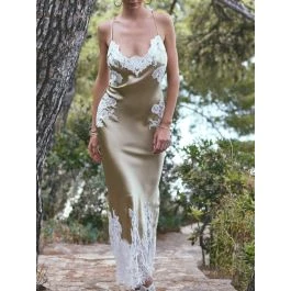 Diese Seidennachtwäsche ist in den Größen 34 bis 40 (deutsche Damengrößen) in einem zarten Goldton mit naturweisser Spitze erhältlich.