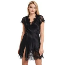 Dieses Modell in zeitlosem Schwarz oder modischem Goldgrün ist in den Größen 36 bis 48 (deutsche Größen) erhältlich. Das Neglige Mailin hat kurze Ärmel aus Spitze und einen mehrfach geschlitzten Saum.
