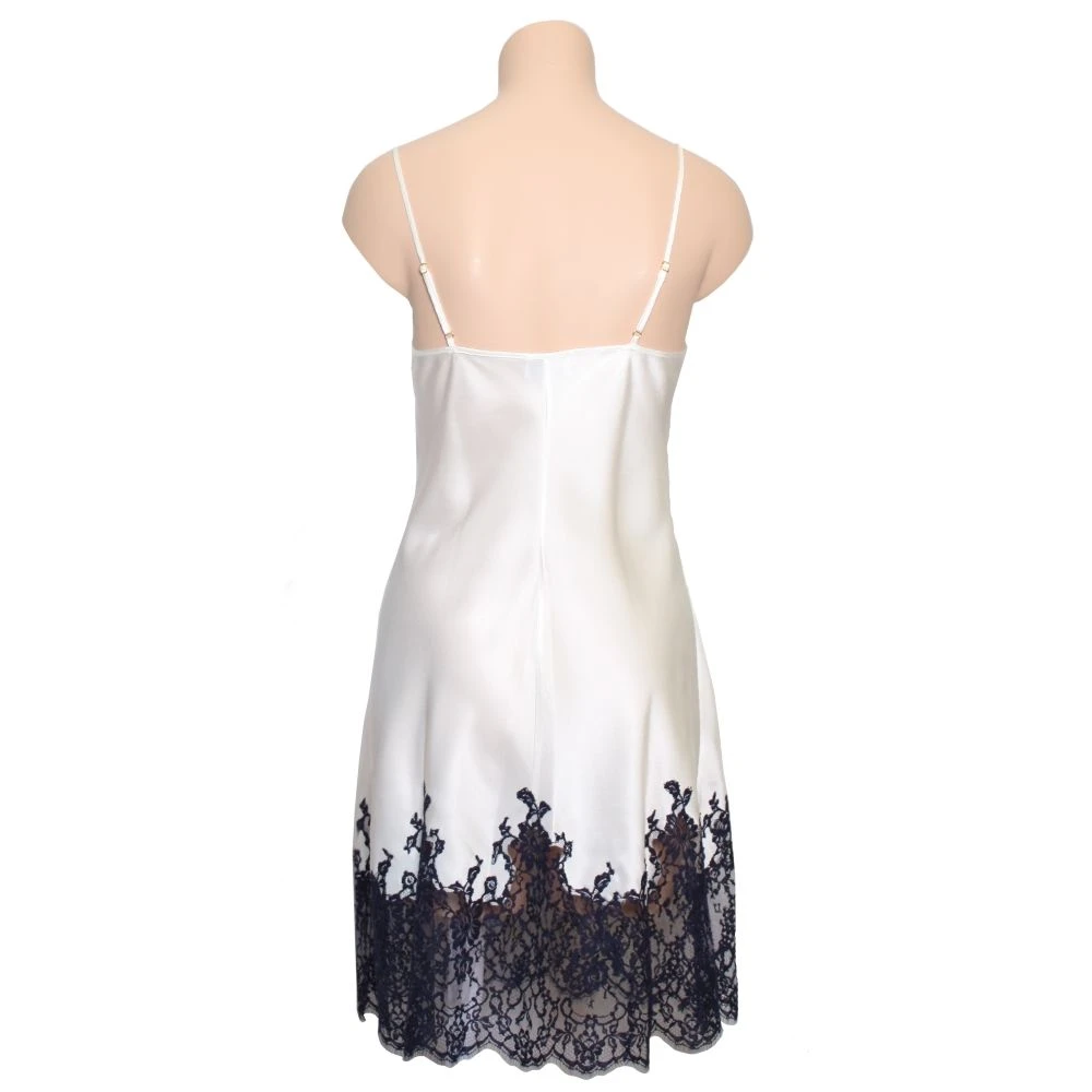 Dieses mittellange Seiden-Negligé ist ca. 90 cm lang und hat verstellbare Spaghetti-Träger. Der Rücken ist aus Seide genäht und ohne Spitze gestaltet.