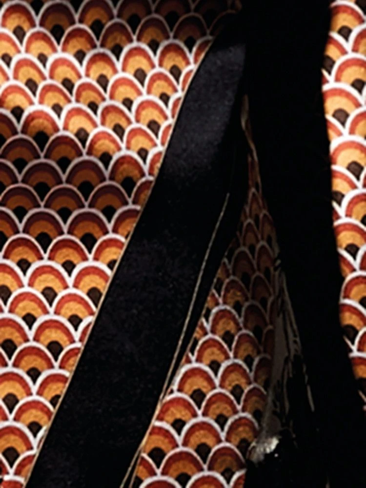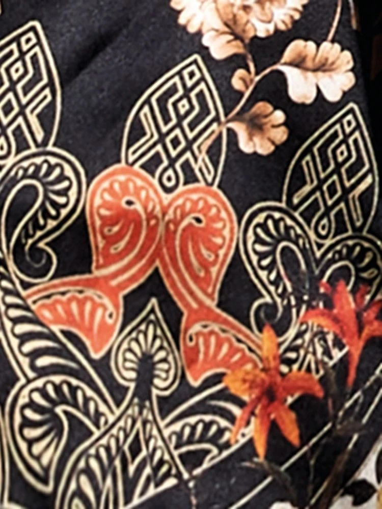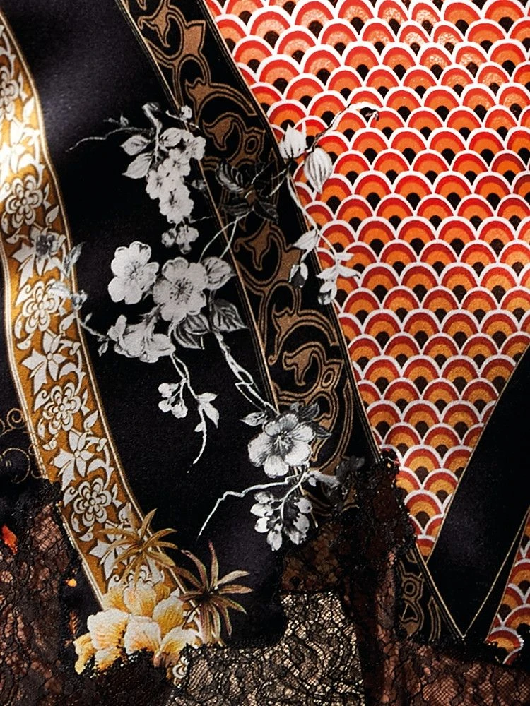 Dieses feminine Nachtkleid besteht aus Stretchseide, wodurch es leicht elastisch ist und der Tragekomfort erhöht wird. Es hat einen fantasievollen Print in schwarz, sand, gold und rostrot.