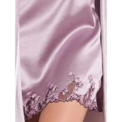 Dieses feminine Nachtkleid besteht aus Stretchseide, wodurch es leicht elastisch ist und der Tragekomfort erhöht wird. Es hat eine ausgefallene Farbe in malve-flieder mit einer mehrfarbig lila bestickten Spitze.