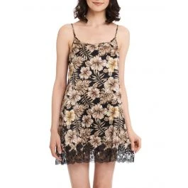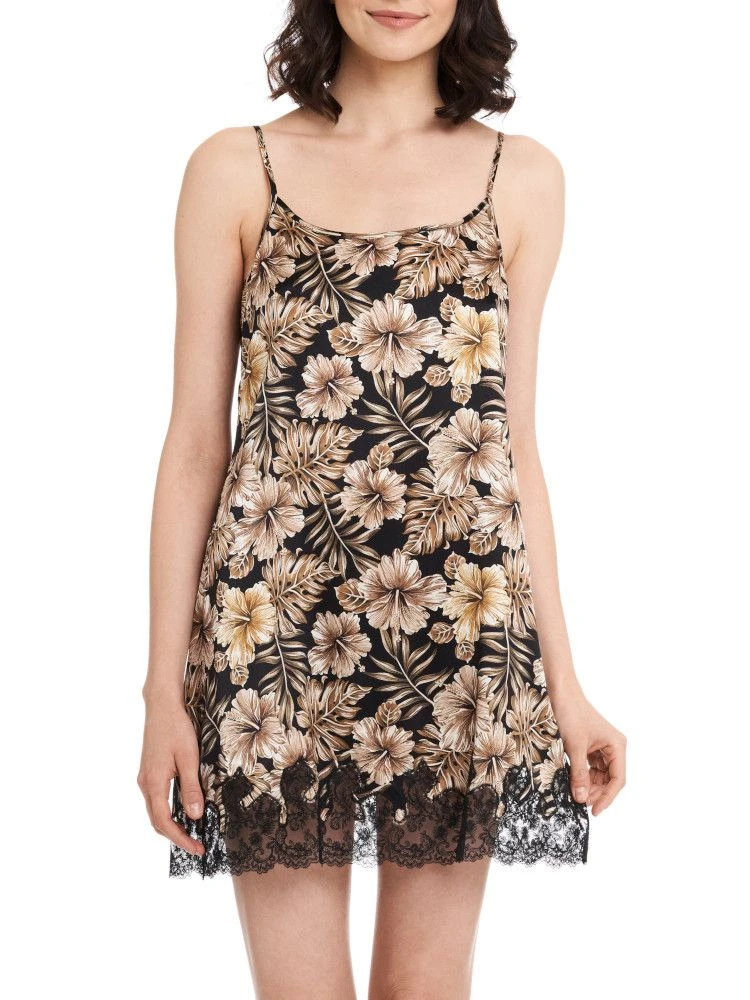 Dieses Modell in Schwarz mit Blumendruck in schoko und gold-bronze ist in den Größen 36 bis 46 (deutsche Größen) erhältlich. Das Neglige Joanna hat verstellbare Spaghettiträger und seitliche Abnäher an der Brust.