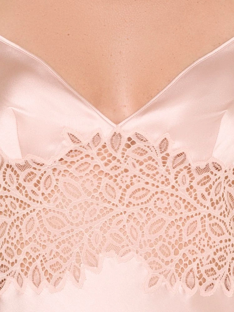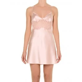 Das kurze Seidennachthemd Wedding fällt in leichter A-Linie und hat einen V-förmigen Ausschnitt auf der Vorder- und Rückseite. Es hat verstellbare Spaghetti-Träger, die auf der Rückseite über Kreuz laufen und ist in der Farbe puder-rosé (rosa polv. 3G7) erhältlich.