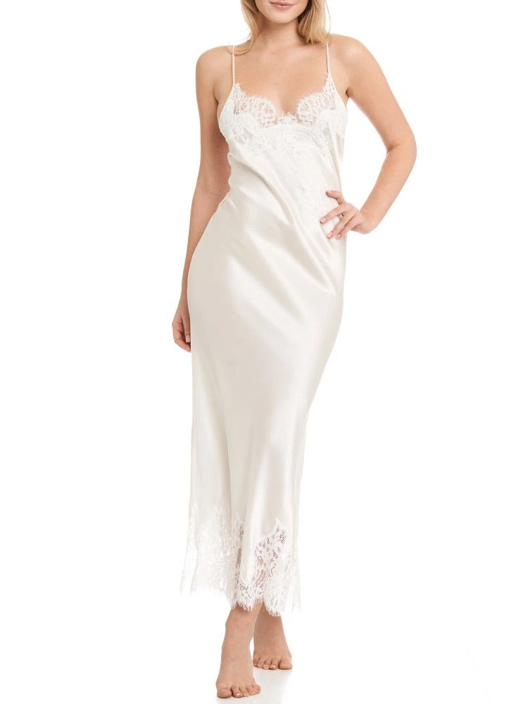 Dieses verführerische lange Seiden-Nachthemd ist aus hochwertigem, weißem oder schwarzem Stretch-Seidensatin (95% Seide, 5% Elasthan) gefertigt. Das knöchellange Neglige (Länge ca. 140 cm) ist oben und unten umlaufend mit einem breiten Besatz von floraler Eye-Lash Spitze besetzt. Das Grundmaterial für dieses aufregende Seidenneglige ist Stretchseide, die zur Verbesserung der Passform einen Elasthan Anteil hat.
