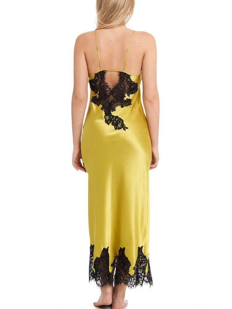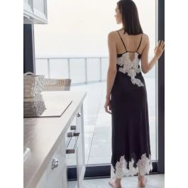 Dieses Modell in zeitlosem Schwarz oder feinem Naturweiß und modischem Goldgrün ist in den Größen 36 bis 48 (deutsche Größen) erhältlich. Zusätzlich gibt es saisonal verfügbare Modefarben. Das lange Neglige Mailin hat verstellbare Spaghettiträger, unten seitliche Schlitze am Saum und eine raffinierte Rückengestaltung.