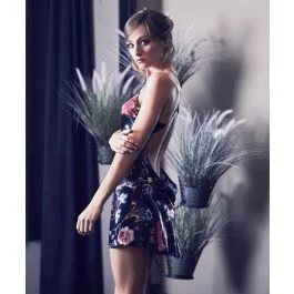 Das kurze Seidennachthemd Fidji der französischen Luxus-Marke Marjolaine ist aus glänzendem Seidensatin (Stretchseide mit 98% Seide, 2% Elasthan) gefertigt. Das edle Material fällt weich und fließend und ist angenehm auf der Haut. Es ist entweder in komplett schwarz oder mit Blütenprint erhältlich. Der exotische Blumendruck auf schwarzem Grund verführt mit seinen Blautönen kombiniert mit Beige-Braun und Akzenten in himbeerrot und pink.