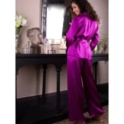 Der besonders elegante Seidenpyjama hat lange Ärmel und ist mit einem Bindegürtel und Knöpfen zu schließen. Das Oberteil hat eine durchgehende Knopfleiste und aufgenähte Taschen. Die Hose ist mit einem Gummibund ausgestattet. Der Pyjama ist in den Größe 34 bis 46 (deutsche Damengrößen) in den folgenden Farben erhältlich.
