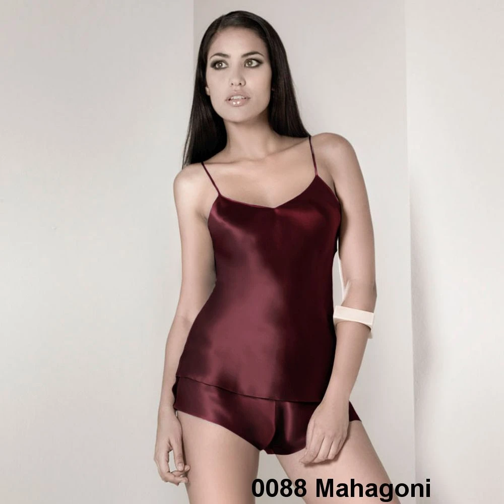 Dieses edle Seiden-Top macht als glänzendes Oberteil oder als seidiges Unterhemd eine gute Figur. Zusammen mit den separat erhältlichen Seidenshorts wird daraus ein luftiger Kurz-Schlafanzug für den Sommer. Das Top ist aus Seidensatin aus reiner Seide und hat eine Länge von ca. 65 cm. Die zierlichen Spaghetti-Träger sind besonders fein verarbeitet und der V-Ausschnitt betont das Decolleté.
