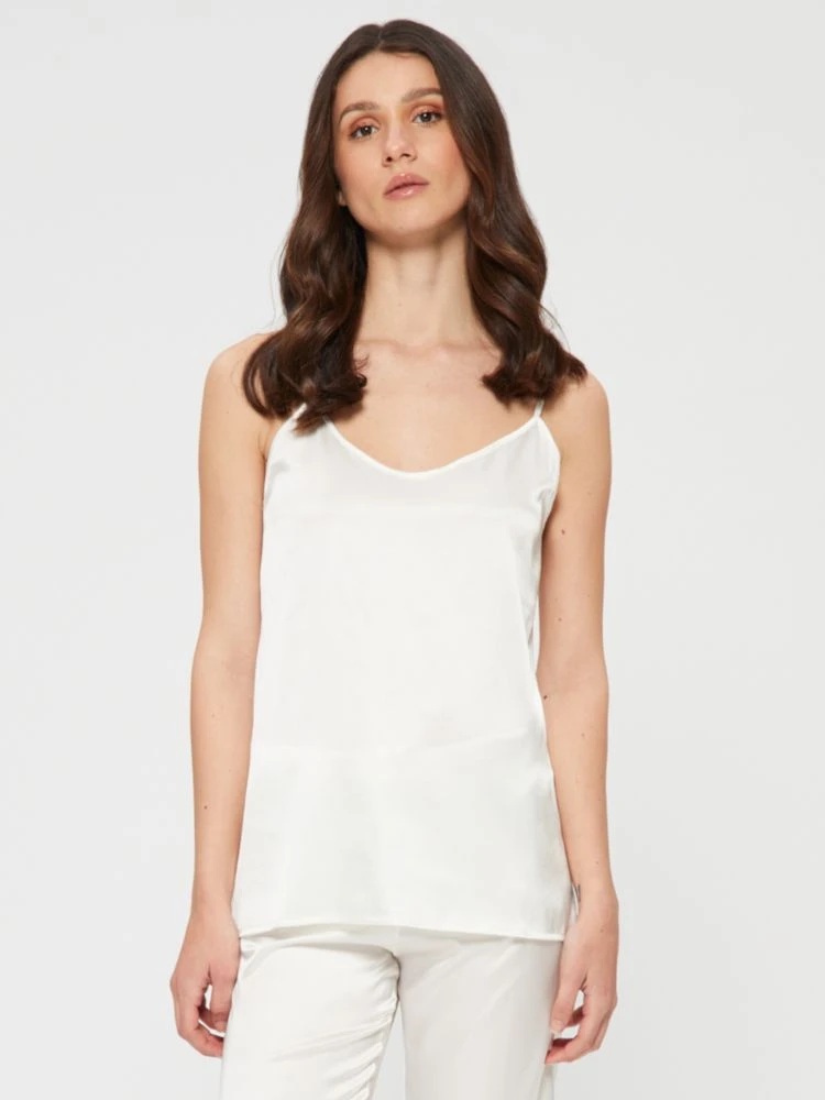 Das Seidentop mit verstellbaren Trägern von Chiara Fiorini besteht aus Seide in einer elastisch gewebten Qualität (96% Seide, 4% Elasthan). Es ist Made in Italy und in den Größen 34 bis 52 erhältlich. Dieses Seidentop ist ca. 60 cm lang und die feinen Spaghetti-Träger sind in der Länge verstellbar.