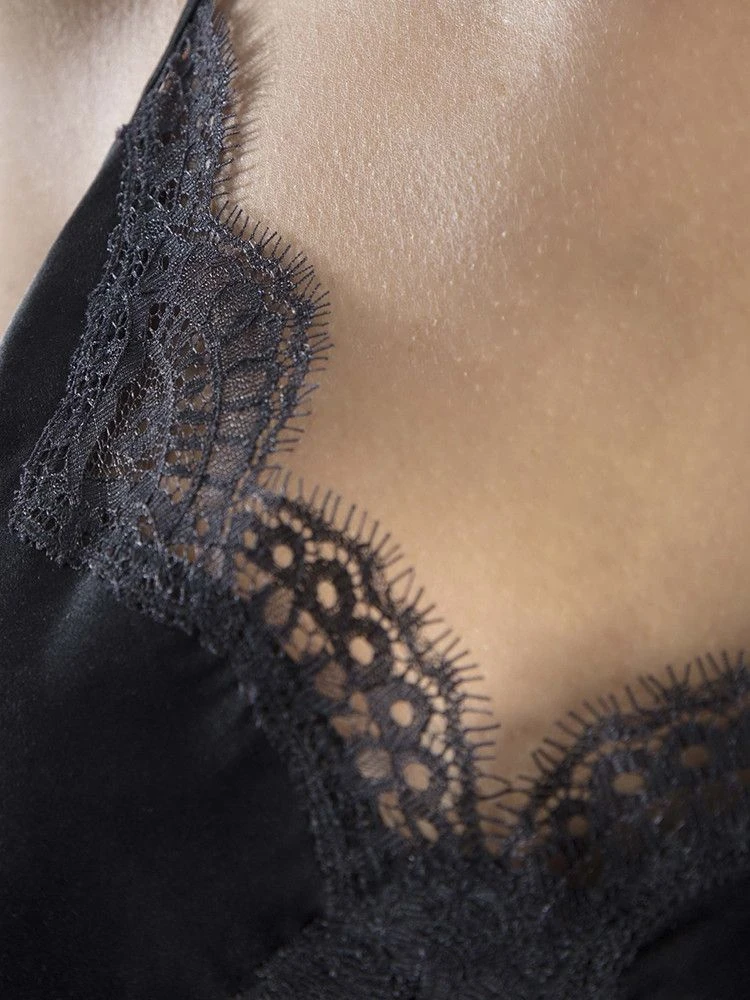 Das Top ist am Decolleté und zusätzlich am Saum umlaufend mit der weichen Spitze benäht. Durch die feine Verarbeitung ist diese Wäsche vielseitig verwendbar – z.B. als Unterwäsche, Schlafbekleidung oder Oberbekleidungs-Top.