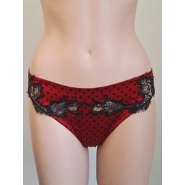 Der bequem geschnittene Slip ist an der Vorderseite mit weichem Tüll hinterfüttert und hat einen Innenzwickel aus Baumwoll-Jersey. Er ist in den Farben rot mit schwarzer Spitze in den folgenden Größen erhältlich: