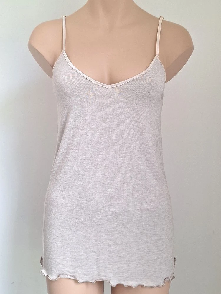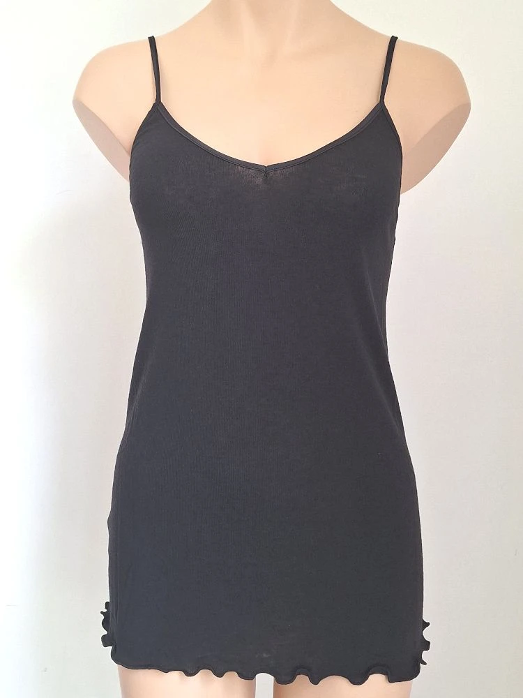 Dieses Top ist am Ausschnitt mit Satin eingefasst und hat längenverstellbare Spaghetti-Träger aus dem gleichen Material. Der untere Saum ist umkettelt und leicht wellig. Aus der gleichen Kollektion gibt es bei uns ergänzende Teile im Shop, die separat bestellbar sind. Diese feine Shirt-Kollektion beinhaltet wunderbare Unterzieh- und Kombinationsteile, die optimal für den Schichtenlook in der Übergangszeit und im Winter sind.