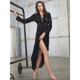 Dieses Loungekleid der französischen Luxus Marke Suggest by Pain de Sucre ist ungefähr 130 cm lang und in zeitlos elegantem Schwarz zu haben. Es ist ungefüttert und in den Größen 36 bis 42 (deutsche Damengrößen) erhältlich. Dieses lange Kleid ist vielseitig zu tragen: es kann als Hauskleid, Nachtwäsche oder Abendbekleidung verwendet werden.