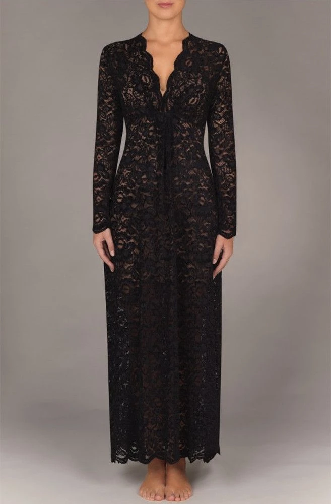 Das Loungekleid Logan 74 von Pain de Sucre Suggest ist eine verführerisch kuschelige Homewear für die kühlere Jahreszeit. Das lange Loungewear Kleid besteht aus einer schmuseweichen Spitze mit Samt-Effekt. Es hat einen tiefen V-Ausschnitt, lange Ärmel und wellige Säume an Ausschnitt und unterem Saum. Das Kleid ist ungefüttert und nicht blickdicht. Sie können es aber auch als Abendkleid verwenden, wenn es mit einem Unterkleid kombiniert wird (Unterkleid ist nicht enthalten).