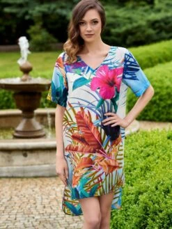 Dieses Strandkleid mit V-Ausschnitt besteht aus einer weichen Polyester Netzspitze mit intensivem Zick Zack Muster in türkisblau, bronze-braun, flieder-lila und gelb. Das Material ist weich und hautschmeichelnd. Das Kleid ist in den Größen 36 bis 42 erhältlich.