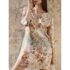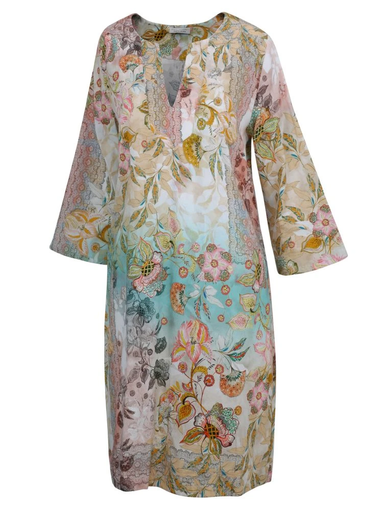 Diese Tunika besteht aus einem feinen Baumwolle Gewebe, welches einen exquisiten Druck von Ornamenten und Blüten auf apricot-rosa und blau hat. Das feine Material aus 100% Baumwolle fällt weich und fließend und hat eine luxuriöse Ausstrahlung. Die Tunika ist in den Größen 36 bis 44 erhältlich.