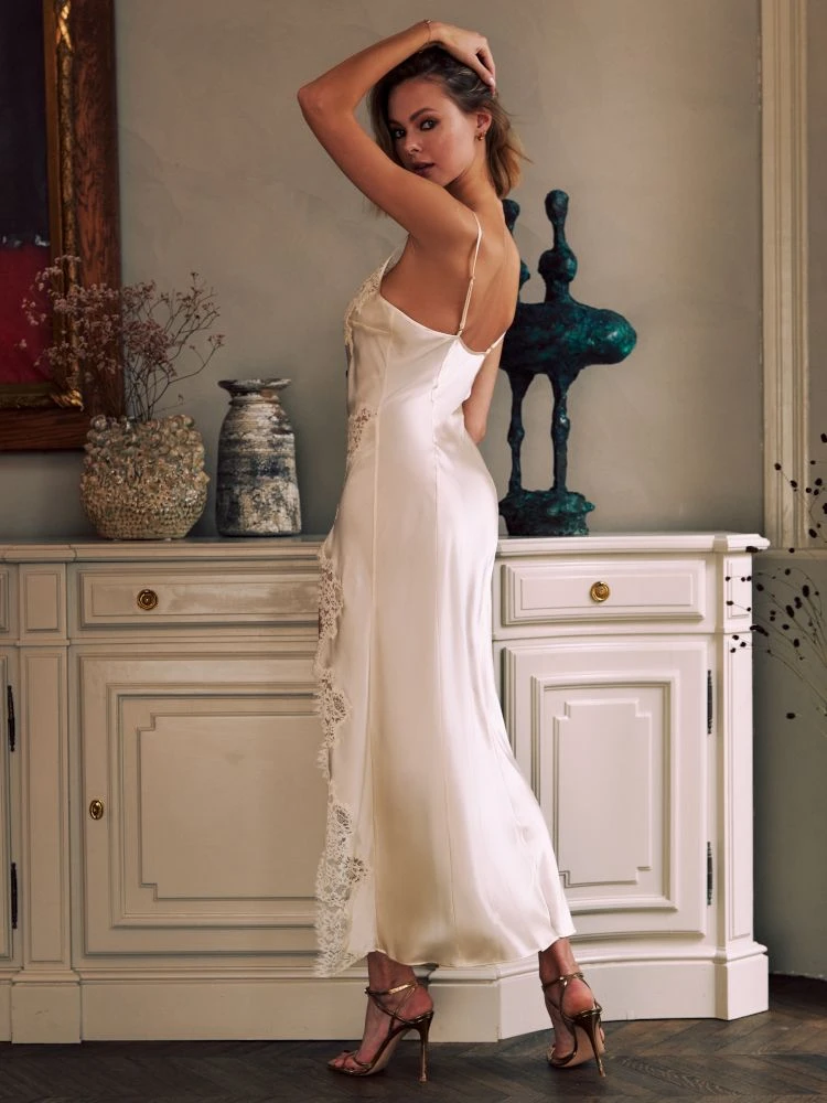 Ein langes Nachthemd der Luxusklasse ist das Seidennachthemd Ruby No. 4 der französischen Edel-Marke Marjolaine. Der edle Seidensatin ist aus 92% Seide und 8% Elasthan gefertigt. Das lange Nachtkleid aus Satin ist kombiniert mit einer floralen Spitze. Die Spitze verziert dabei den Ausschnitt und den langen, seitlichen Schlitz.