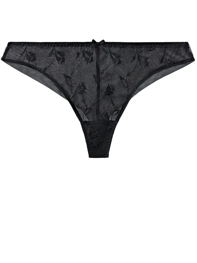 Der Brazilian String ist aus Tüll und bestickter Tüllspitze gefertigt. Der Tüll ist hinten in Futteralverarbeitung verwendet für besonders flache Kanten. Der String ist semitransparent und hat einen Innenzwickel aus Baumwolljersey.