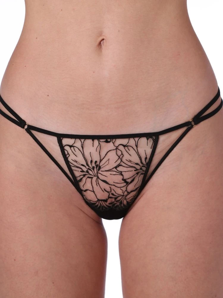 Der String Tanga Ashley von Ritratti ist aus einer schwarzen floralen Spitze auf einem creme-/hautfarbenen Tüll gefertigt (Tüll: 82% Polyamid und 18% Elasthan, Spitze: 75%Polyester, 25% Elasthan). Der Slip hat einen Innenzwickel aus einem Baumwolljersey (100% Baumwolle).