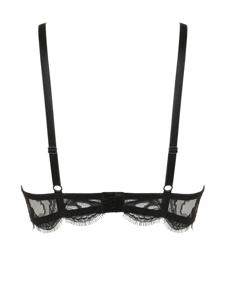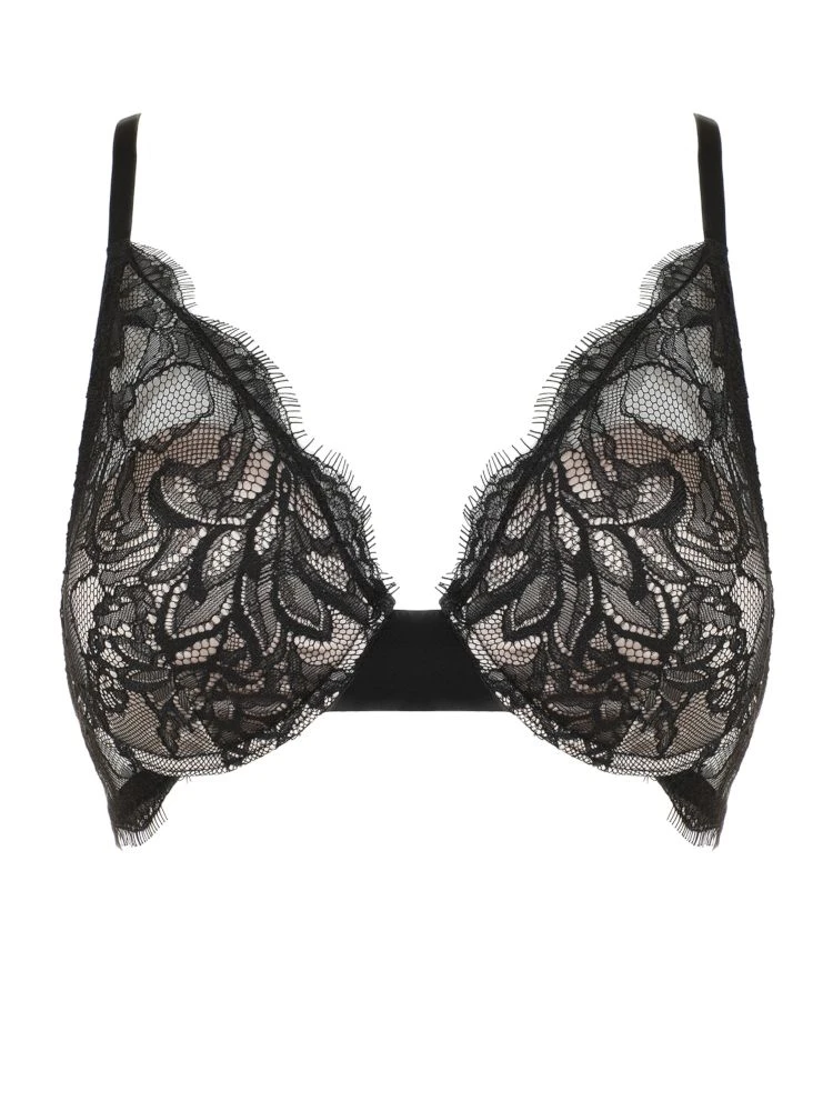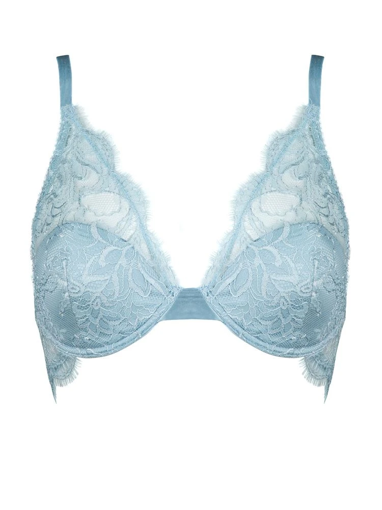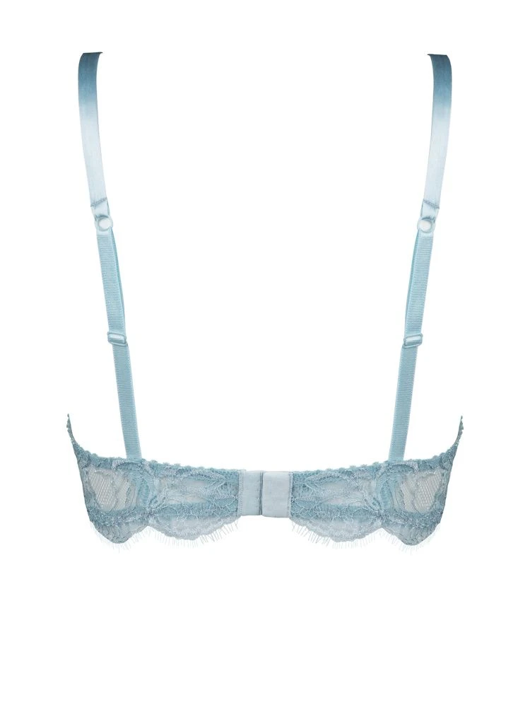 Der reizende Triangel BH Valse von Prelude Milano ist Spitzenwäsche Made in Europe. Das edle Teil besteht aus floraler Eye-Lash Spitze und glänzendem Satin, aufgrund der Spitze ist der BH teilweise semitransparent.