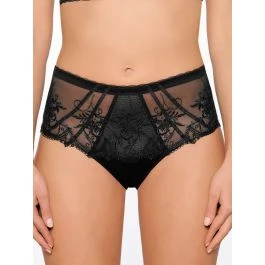 Der Hohe Slip Cravache ist eine luxuriöse Lingerie aus Spitze der französischen Edel-Dessous Marke Millesia. Der Taillenslip besteht aus besticktem Tüll, der zum Rand in eine Richelieu Stickerei übergeht. Im unteren Bereich ist dieser Hohe Slip aus unbesticktem Tüll gefertigt und daher transparent.