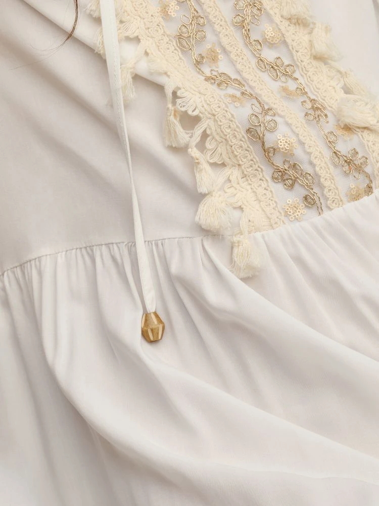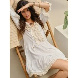 Das kurze Tunikakleid Crema mit weitem Schnitt von Fiori di Chiara besteht aus feiner Viscose in einer leichten Batist Qualität (100% Viscose). Es ist Made in Italy und in in den Größen S bis XL erhältlich. Ausverkaufte Größen sind hier nicht nachbestellbar. Die Tunika hat einen V-Auschnitt mit verstellbarem Schnürbändchen. Sie ist mit Fransen und einer Zierborte verziert und hat halblange Ärmel.
