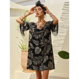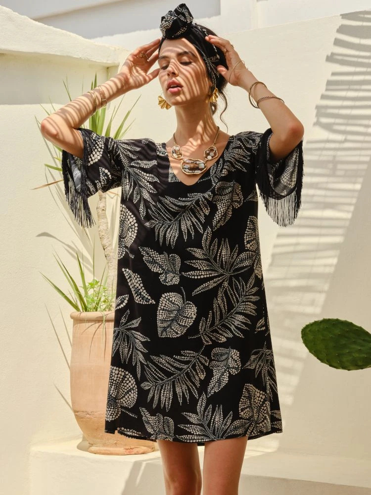 Die kurze Sommertunika Leaves mit geradem Schnitt von Fiori di Chiara besteht aus feiner Viscose in einer leichten Web-Qualität (100% Viscose). Es ist Made in Italy und in in den Größen S bis XL erhältlich. Ausverkaufte Größen sind hier nicht nachbestellbar. Die Tunika hat halblange Ärmel, welche mit einem Fransenrand verziert sind.