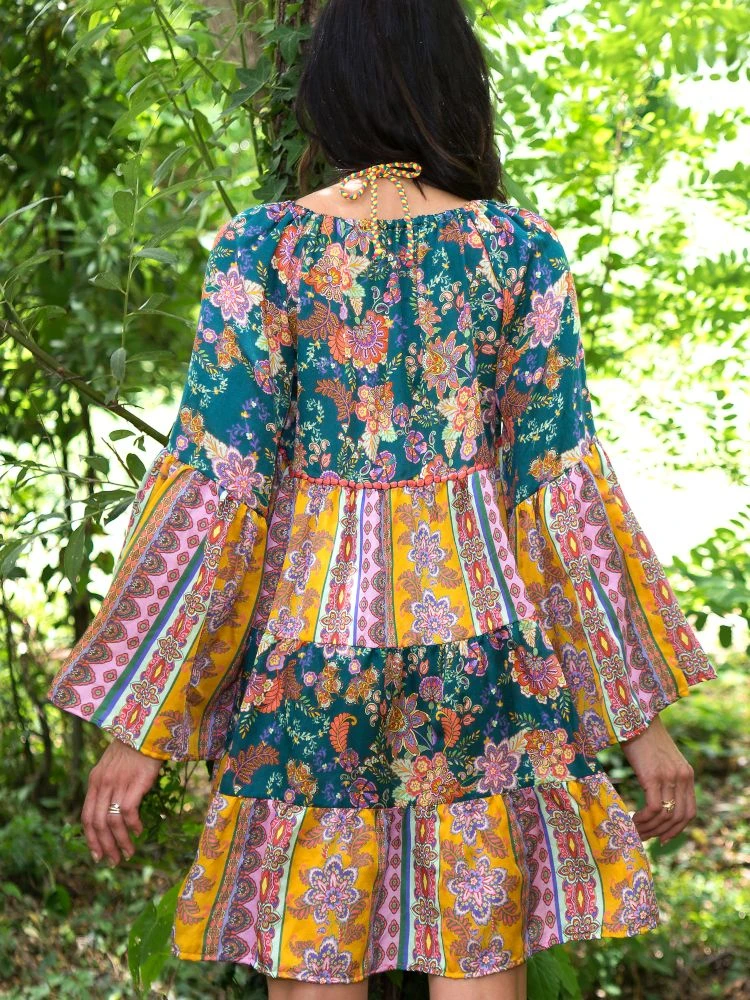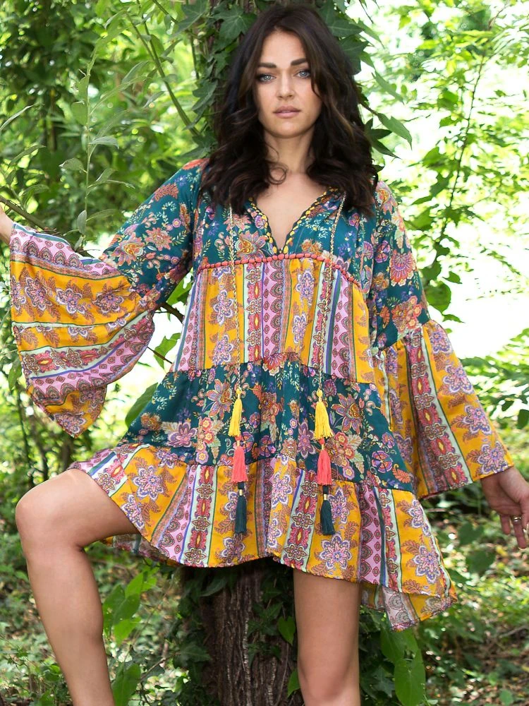 Das kurze Tunikakleid Caterina der italienischen Luxus-Marke Laetitia Beachwear ist aus feinem Batist (65% Baumwolle, 35 % Seide) gefertigt. Das exklusive Kleid ist in einem Mustermix mit floralen Mustern gearbeitet und in echter Handarbeit mit Häkelsäumen verziert. Der Ausschnitt ist umhäkelt und die Ärmel werden ab der Hälfte weiter. Am Ausschnitt befindet sich eine bunte Kordel mit Fransen am Ende.