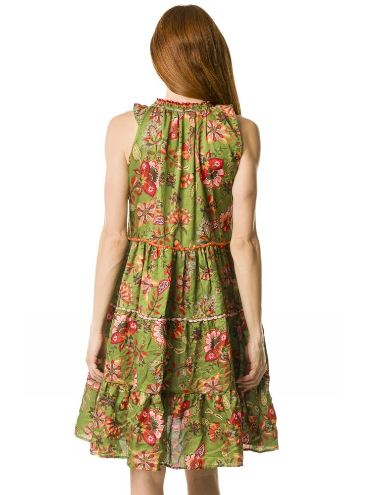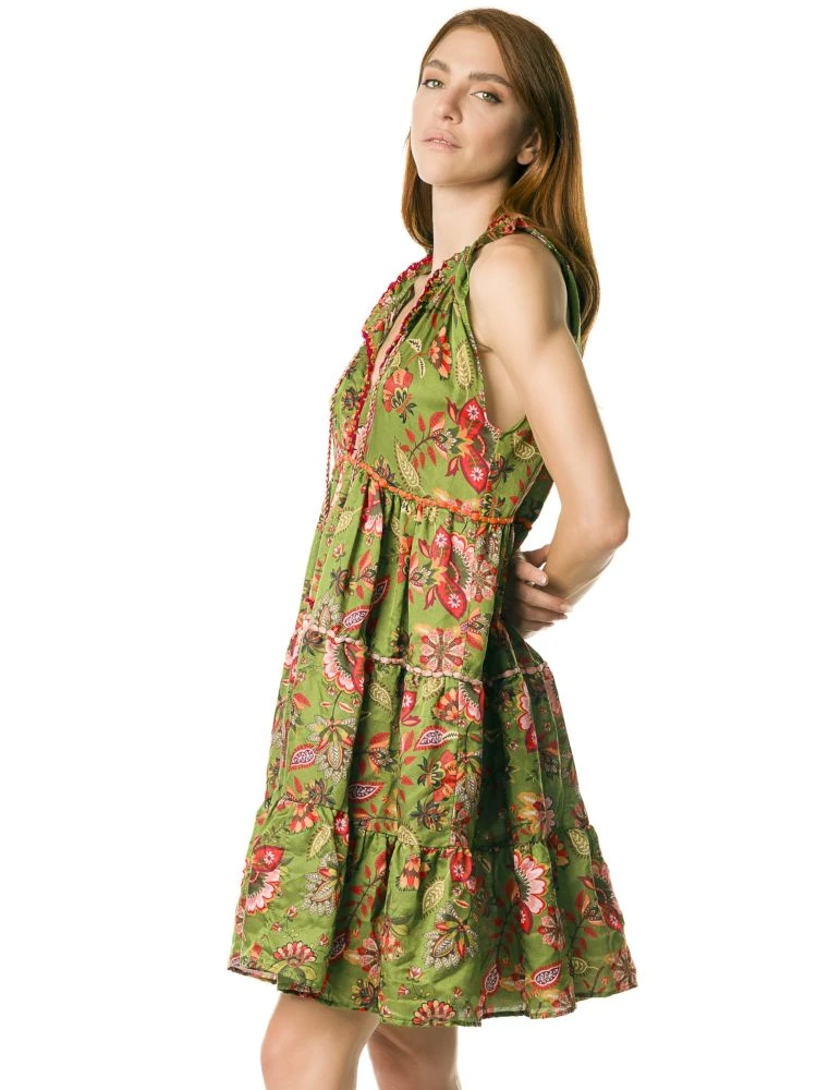 Das kurze Tunikakleid Dafne der italienischen Luxus-Marke Laetitia Beachwear ist aus feinem Batist (65% Baumwolle, 35 % Seide) gefertigt. Das exklusive Kleid ist in einem Mustermix mit floralen Mustern gearbeitet und in echter Handarbeit mit Häkelsäumen verziert. Der Ausschnitt ist umhäkelt und die Tunika ist ärmellos. Am Ausschnitt befindet sich eine bunte Kordel mit Häkelblumen am Ende.