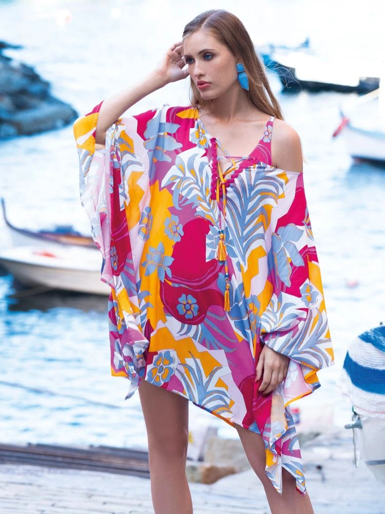 Die Strandtunika im Foilard Schnitt von Chiara Fiorini besteht aus Viscose in einer luftig leichten, gewebten Qualität (100% Viscose). Sie ist Made in Italy und in den Größen 36 bis 44 erhältlich. Ausverkaufte Größen sind hier nicht nachbestellbar. Diese Tunika ist ca. 84 cm lang und mit einem Ausschnitt mit Schnürung gestaltet. Sie ist als Foilard Tuch mit Öffnung für den Kopf gestaltet. Seitlich ist dieses Strandkleid geschlitzt und offen