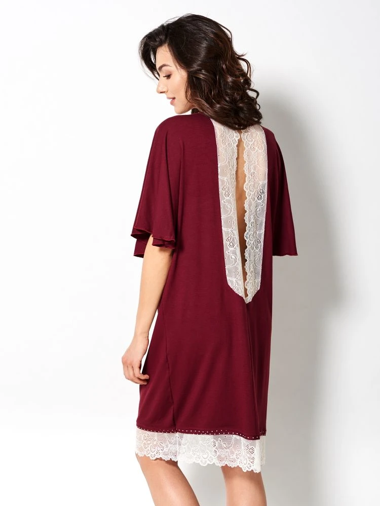 Dieses Viscose Sleepshirt hat angeschnittene kurze Ärmel und einen Rücken-Ausschnitt mit Spitze. Es ist gerade geschnitten, etwa 85 cm lang und hat am unteren Rand einen Saum aus Spitze.
