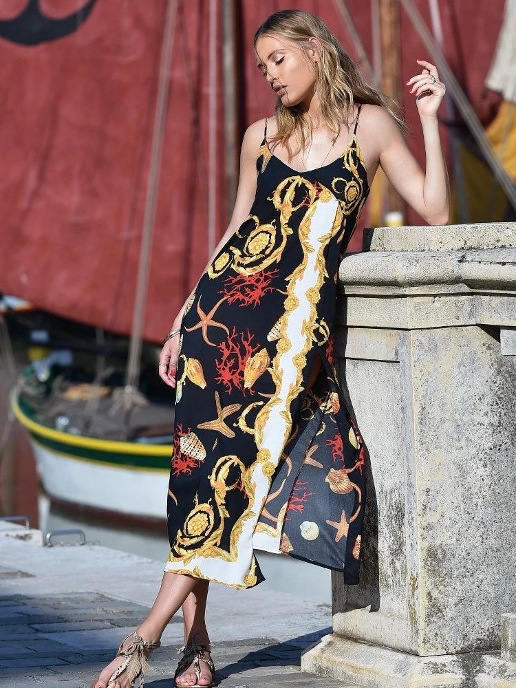 Dieses sommerliche Kleid hat einen ausgefallenen Druck mit Muscheln, Seesternen und Korallen auf schwarzem Grund. Es ist perfekt für die warme Jahreszeit geeignet, ungefüttert und kann daher als Strandkleid, Sommerkleid oder auch als gemütliche Loungewear getragen werden.